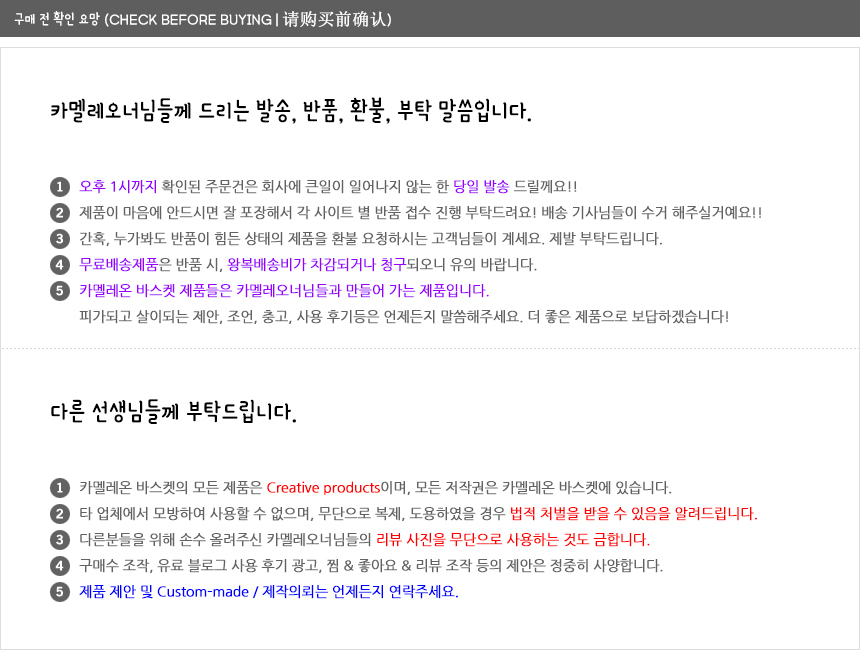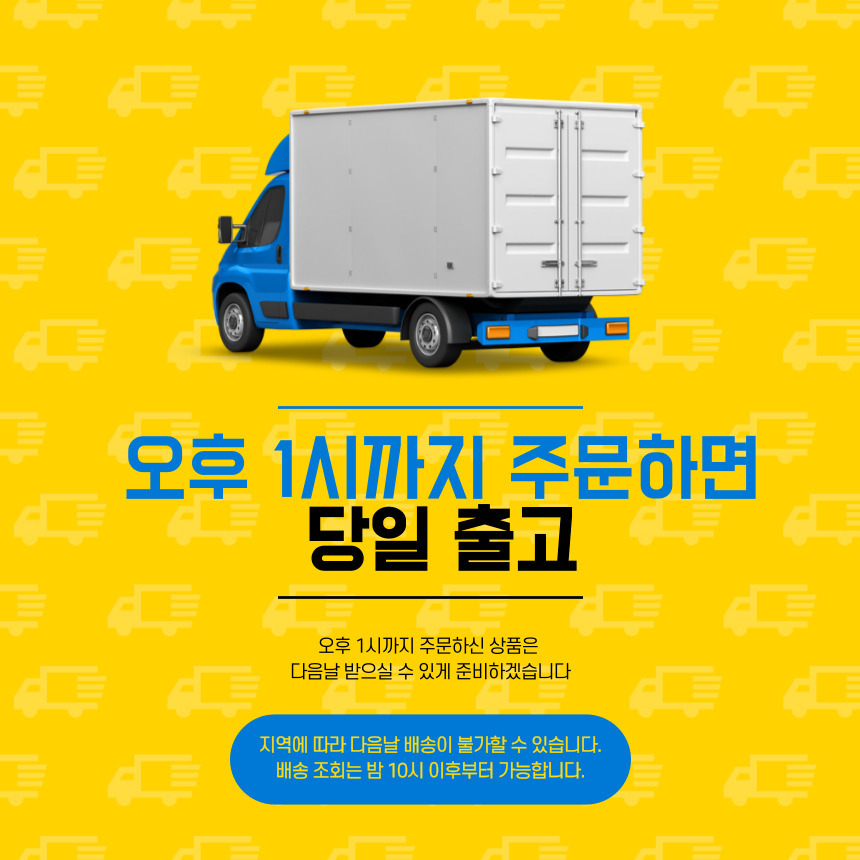 본 쇼핑몰의 모든 상품들은 자사에서 직접 제작을 하므로 재고가 없을 경우 제작기간 포함 1~2주정도 소요됩니다. 도서지역은 2~4일 지연될 수 있으며 배송비가 추가 될 수 있으니 이 점 양해하여 주시기 바랍니다. 교환/반품 안내